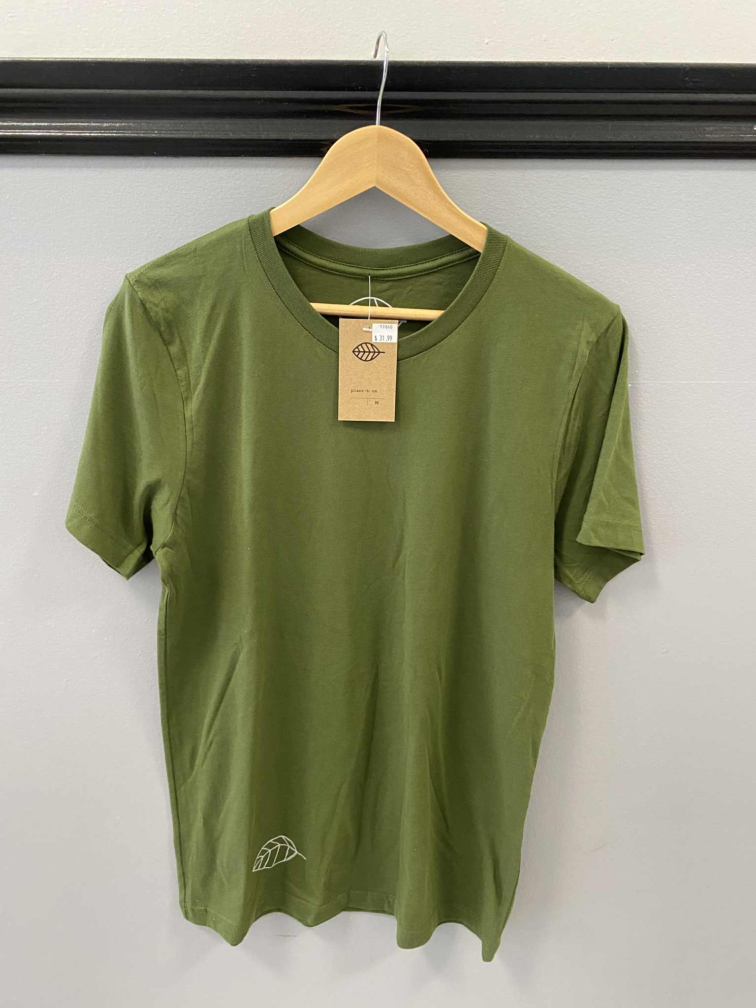Our ultra comfy light weight tee in olive green. Ethically and sustainably manufactured using blue sign certified dyes. On this shirt we added our origins print on the back and a hand drawn leaf on front hip. Look great and feel ready for adventure with our Plant- B super soft tee.